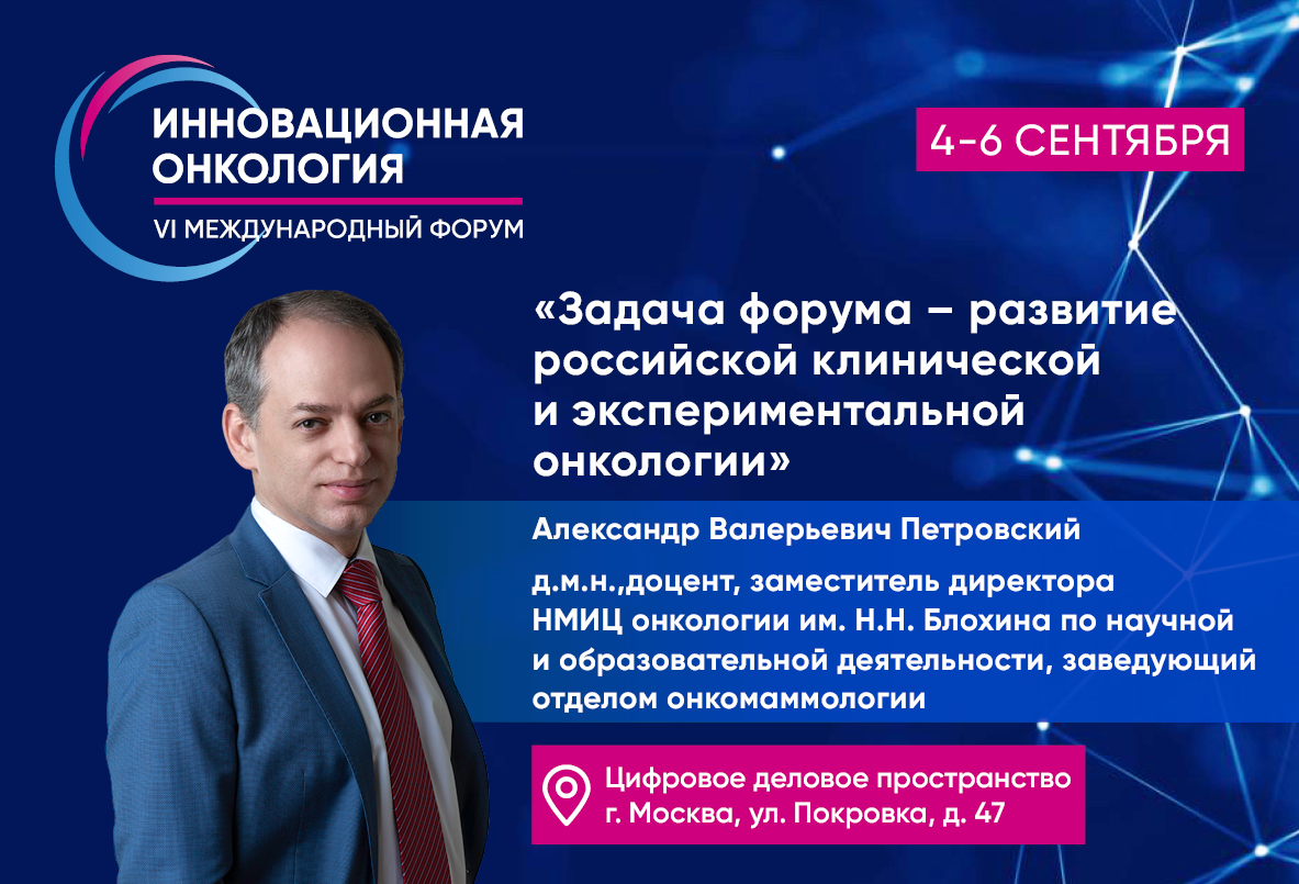 Симбиоз науки и практики, коллаборация между врачами и биологами, онкологический брейн-ринг – о VI Форуме «Инновационная онкология» рассказывает Александр Петровский, заместитель директора НМИЦ онкологии им. Н.Н. Блохина по научной и образовательной деятельности, заведующий отделом онкомаммологии.